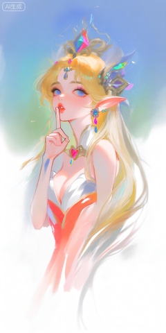 a digital illustration shoot from a portrait camera angle about a fantasy character with long, flowing blonde hair and vibrant colors, wearing a colorful outfit with a jeweled headpiece and a shushing gesture, the image also shows a young woman with fair skin and blue eyes, who appears to be in her early twenties, standing in the middle of the image, with her upper body facing the viewer and looking directly at them, she has a slender physique and is wearing a revealing white and red dress with a plunging neckline, showcasing her cleavage, the dress has a heart-shaped design on the chest, and she is wearing earrings, her hair is styled in a long hair style with a hair ornament, and her lips are parted, as if she is about to say something, the background is a gradient of blue and green, with a soft, dreamy effect, and the lighting is bright and colorful, creating a vibrant and ethereal atmosphere,