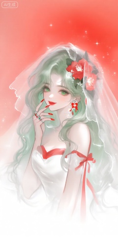 a digital illustration shoot from a portrait camera angle about a beautiful woman with long, wavy light green hair and a red flower in her hair, wearing a white and red bridal outfit with a veil, the image also shows a soft, ethereal background with a red gradient and sparkles, on the middle of the image, a young woman appears to be in her early twenties, with light skin, green eyes, and a gentle smile, she has a slender physique and is wearing a strapless white dress with red ribbons, her hair is styled in long hair, and she is looking directly at the viewer with a serene expression, she is holding her hand near her face, and her fingernails are painted with red nail polish, on her right hand, she has several rings on her fingers, and on her left hand, there is a ring on her finger, the overall style is semi-realistic with a touch of fantasy, and the image is high quality with a focus on the womans beauty and elegance,