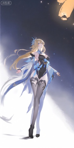 a digital illustration shoot from below about a fantasy character with long flowing hair, wearing a revealing outfit with blue and white accents, the image also shows a young woman standing in the middle of the image, with her full body visible, she has long blonde hair, blue eyes, and is wearing a black and blue outfit with a plunging neckline that reveals her small breasts, her hair is styled in a long hair style, and she is wearing black high heels, she is standing with her arms outstretched, looking to the side with a serene expression, the background is a dark, starry sky with a lantern in the top right corner, the lighting is soft and diffused, casting gentle shadows on her body,