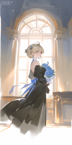 a digital illustration shoot from a profile camera angle about a young woman in a black dress holding a bouquet of blue flowers, standing in a grand room with large arched windows, the image also shows soft lighting and a warm atmosphere, on the middle of the image, a 1woman, who appears to be in her early twenties, with short blonde hair styled in a bun, blue eyes, and a gentle expression, is standing with her upper body facing the viewer, she has a slender physique and is wearing a black, elegant dress with long sleeves and a blue ribbon around her waist, her hair is adorned with a hair ornament, and she is wearing earrings, she is holding a blue bouquet in her right hand, and her left hand is resting on her hip, the woman is standing in front of a large, arched window with soft sunlight streaming in, creating a gentle glow on her face and body, the background is a grand, ornate room with high ceilings and large windows, adding to the sense of grandeur and elegance,