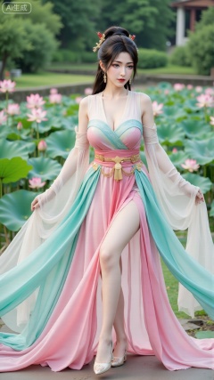 (masterpiece, best quality:1.2),1girl, navel, solo, midriff, bare shoulders, hair ornament,(long hair),(High double ponytail:1.49), red lips, BREAK, (looking at viewer:1.39), chinese clothes,(Holographic Color long dress:1.36), (lace,Rainbow Gradient Color:1.28), BREAK,blurry, solo focus, long hair, lips, daytime, lipstick, outdoors, standing,upper body,(huge breasts:2.89), background, solo, makeup,(Stockings, high heels:1.29),(huge breasts:2.99),(full breasts:2.99),,(Background with lotus pond and pink lotus flowers:1.39),,,,Xbigbreasts,XbaifengsongyuYH,XzhouzimoH,XliancangH,XmupeilingHongyi,XyinyueX3
