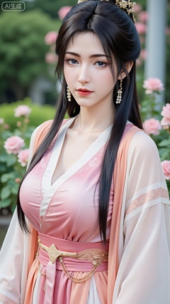 (masterpiece:1.2),best quality,,A woman adorned in traditional Chinese attire,(pink|white dress,black long hair),featuring a flowing robe with intricate embroidery and floral accents. A garden filled with pink roses and lush greenery. Soft pastel hues of white,blue,and green,creating a serene atmosphere. Photorealistic photography.,(huge breasts:2.99),(full breasts:2.99),,,,Xbigbreasts,XbaifengsongyuYH,XzhouzimoH,XliancangH,XmupeilingHongyi,XyinyueX3