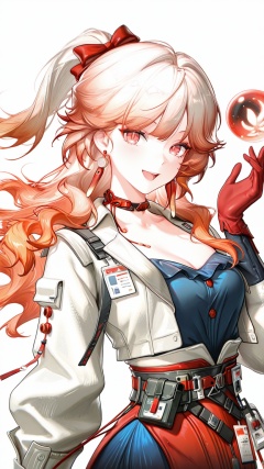 masterpiece,best quality,amazing quality,<lora:3d-000029:0.8>,<lora:20250801-1754050342184:0.8>,unreal 3DCG,yao\(arknights\),upper_body,yao\(arknights\),1girl,solo,red gloves,dress,white background,white jacket,blue dress,long hair,red bow,looking at viewer,gradient hair,orange hair,hair bow,smile,jewelry,simple background,earrings,long sleeves,open jacket,puffy sleeves,open clothes,open mouth,breasts,orb,red choker,belt,pouch,cleavage,hand up,red eyes,choker,shadow,ribbon,red dress,red eyes,1girl,solo,orange hair,gradient hair,