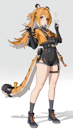 masterpiece,best quality,amazing quality,<lora:jufufu-000016:0.8>,ju fufu\(zenless zone zero\),1girl,solo,tiger tail,tiger ears,green eyes,orange hair,full body,<lora:20250808-1754650692631:0.8>,zhigan3d,1girl,solo,breasts,jewelry,looking at viewer,v,