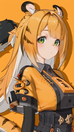 masterpiece,best quality,amazing quality,<lora:jufufu-000016:0.8>,ju fufu\(zenless zone zero\),1girl,solo,tiger tail,tiger ears,green eyes,orange hair,upper body,<lora:20250808-1754650692631:0.8>,zhigan3d,1girl,solo,breasts,jewelry,looking at viewer,