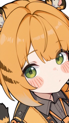masterpiece,best quality,amazing quality,<lora:jufufu-000016:0.8>,ju fufu\(zenless zone zero\),1girl,solo,tiger tail,tiger ears,green eyes,orange hair,upper body,<lora:qban1:1>,qban1,1girl,solo,white background,simple background,looking at viewer,blush,blush stickers,