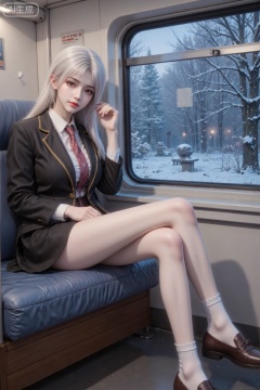 1girl,solo,white hair,yellow streaked hair,long hair,antenna hair,crossed bangs,blunt bangs,brown eyes,(tan:1.1),black school blazer,white shirt,red tie,blue serafuku,white sock,brown loafers, \\//, 1girl, solo, \ resting on train seat, forehead against window, \ trans-siberian railway carriage, frosted birch forests, abandoned stations, soviet-era luggage rack, \ blue hour exterior, warm tungsten interior, breath fog on glass, \ nostalgic color science, analog film texture, liminal space poetry