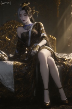 A highly detailed CGI image of a beautiful Asian woman with pale skin and long black hair,styled with a white streak and adorned with gold hairpins. She wears an elegant,ornate black and silver dress with a high slit,revealing her thigh.,wearing black high heels,, She reclines on a luxurious bed,positioned centrally in the frame. Her body is angled slightly to the side,with her right arm bent and resting on the bed,while her left arm is gently placed on her waist. Her legs are slightly bent,with one leg resting over the other,exuding an air of relaxed elegance. The scene is enhanced by warm,golden lighting that casts soft shadows across her figure and the ornate bed,highlighting the intricate details of her attire and the luxurious surroundings.,masterpiece,best quality,astonishing quality,ultimate aesthetics,absurd,best quality,ultimate aesthetics,masterpiece,emotional masterpiece,extraordinary above all,mastery of details,, Negative prompt: ng_deepnegative_v1_75t,(badhandv4:1.2),EasyNegative,(worst quality:2),,nsfw, Steps: 30, Sampler: DPM++ 2M, CFG scale: 3.5, Seed: 351526815, Size: 1024x1536, Model hash: 062dad72b2, Model: 麦橘超然majicFlus_v1.safetensors, Denoising strength: 0, RNG: CPU, Lora 1: 20250904-1756986734983-0010, Lora Hash 1: 1d768e946d, Lora Weight 1: 1.2, Lora 2: 《墨染冥照》|古风插画|唯美意境画风系列, Lora Hash 2: 0c05ef6259, Lora Weight 2: 0.6, vae_name: automatic