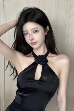 超写实风格拍摄年轻女性。她拥有一头乌黑亮丽的长发,部分发丝自然垂落,额前有轻薄碎发修饰。五官精致,眼眸明亮有神,睫毛纤长卷翘,鼻梁小巧挺拔,唇瓣粉嫩润泽,透着自然的水光感。身着一件黑色挂脖上衣,领口处装饰有一朵立体的黑色花朵,布料质感光滑。她单手抬起放在头部一侧,姿态优雅。背景为浅木色墙面,光线柔和,营造出一种简约又时尚的氛围。画面需具备8K分辨率,呈现超高清晰度,色彩真实自然,光影过渡细腻,高锐度、低噪点,突出人物主体。