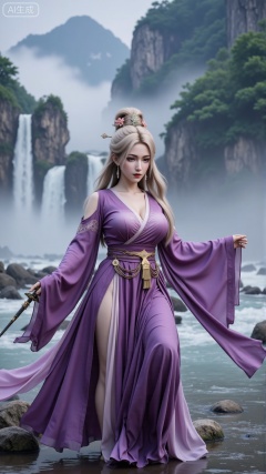 (masterpiece,best quality:1.23),Dominant sister-type girl, purple velvet ancient style long dress, perfect body, in a valley with a rushing waterfall, holding a long sword, sharp gaze, mist pervading, magnificent aura.(huge breasts, full breasts:2.99),,,Xbigbreasts,XbaifengsongyuYH,XzhouzimoH,XliancangH,XmupeilingHongyi,XyinyueX3