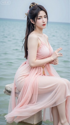 (masterpiece,best quality:1.23),screen description On the clear shallow water, the low angle shot presents a unique perspective, focusing on the woman in a light pink gauze suspender dress. Her long hair hangs gently, and the exquisite accessories between her hair add a bit of fairy spirit. The legs overlap gracefully, sitting cross-legged. As the skirt hem is naturally sagging, coupled with the shooting of the low camera position, the edges of the light pink safety pants are quietly revealed. He stepped on the water barefoot steadily, and his slender heels and thin anklets swayed gently with the water waves. She gently supported one hand against the stone, her posture relaxed but had an elegant rhythm, her back was naturally straight and her shoulder line was stretched. The thin fabric of the suspender skirt was close to her body, and it looked smooth and shiny against the backdrop of water. She looked at the camera, her face was delicate, her eyebrows and eyes were filled with a cold fairy spirit, and the seemingly faint curve of the corners of her mouth added a bit softer. The sky behind me is light and soft, blending with the reflection on the water. The 8K-level picture quality accurately presents the light texture of the clothes and the delicate patterns of the hair, like a cold fairy walking out of the fairyland scroll. The low angle further highlights the character's slender figure, with the hem of the skirt, water waves, barefoot and transparent black silk intertwining a ethereal and beautiful dreamy atmosphere. Every detail tells the poetry flowing in the static picture.(huge breasts, full breasts:2.99),,,Xbigbreasts,XbaifengsongyuYH,XzhouzimoH,XliancangH,XmupeilingHongyi,XyinyueX3
