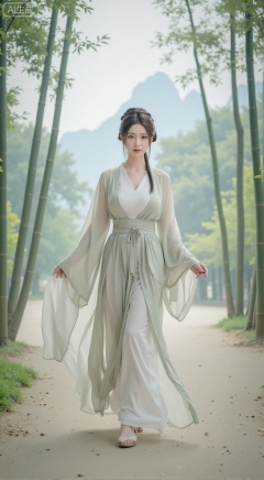 SFW,,(masterpiece,best quality:1.23), full body, a young girl, elegant, Weijin style hanfu, flowing robes, ink wash painting style, walking in a misty bamboo forest, mountains in the distance, subtle light, morning mist, falling leaves, tranquil atmosphere, soft focus background,XbaifengsongyuYH,Xbigbreasts,Xyehuiling,XtangwutongXnb,Xyinyangjiaoshengnv,XmupeilingHongyi