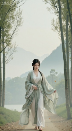 SFW,,(masterpiece,best quality:1.23), full body, a young girl, elegant, Weijin style hanfu, flowing robes, ink wash painting style, walking in a misty bamboo forest, mountains in the distance, subtle light, morning mist, falling leaves, tranquil atmosphere, soft focus background,XbaifengsongyuYH,Xbigbreasts,Xyehuiling,XtangwutongXnb,Xyinyangjiaoshengnv,XmupeilingHongyi