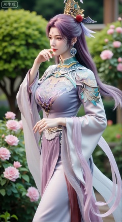 (masterpiece:1.2),best quality,,A woman adorned in traditional Chinese attire,(long dress,long hair),featuring a flowing robe with intricate embroidery and floral accents. A garden filled with pink roses and lush greenery. Soft pastel hues of white,blue,and green,creating a serene atmosphere. Photorealistic photography.,(huge breasts:2.99),(full breasts:2.99),XbaifengsongyuYH,Xbigbreasts,Xyehuiling,XtangwutongXnb,Xyinyangjiaoshengnv,XmupeilingHongyi,XsiyouyouYH