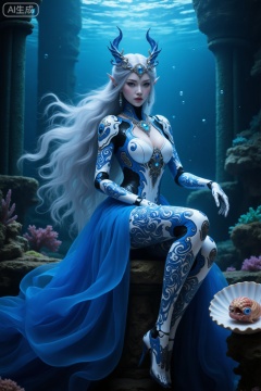 1girl, coral, long hair, solo, sitting, underwater, breasts, jewelry, blue eyes, cleavage, earrings, bubble, air bubble, pointy ears, gem, shell, fish, necklace, pillar, mermaid, white hair, medium breasts, full body, joints, dress, seashell, jellyfish, head fins, looking at viewer, hair ornament, blue dress