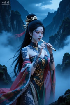 1girl, solo, black hair, instrument, flute, long hair, forehead mark, jewelry, night, mountain, hair ornament, earrings, colored skin, chinese clothes, music, bare shoulders, shawl, facial mark, dress, playing instrument, breasts, fog