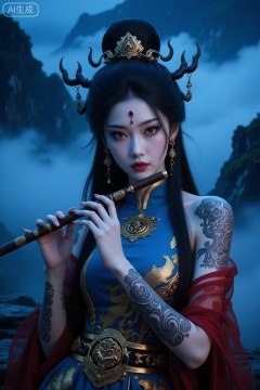 1girl, solo, black hair, instrument, flute, long hair, forehead mark, jewelry, night, mountain, hair ornament, earrings, colored skin, chinese clothes, music, bare shoulders, shawl, facial mark, dress, playing instrument, breasts, fog