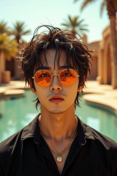 In the middle of a vast desert oasis, a handsome guy with short, messy black hair and bangs is standing. He's wearing a black shirt, a necklace, and some jewelry. His round orange - tinted sunglasses cover his eyes as he looks directly at the viewer with his parted red - lipped mouth. The sunlight casts a warm glow around him, and the blurry background of palm trees and clear water adds an otherworldly touch.