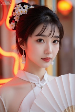 Close-up of an Asian woman wearing white Chinese clothes, silver necklace and earrings. She was holding a white fan. The lady's hair was dotted with white flowers, adding a touch of beauty to the scene. The background is blurred, creating a soft focus on the woman's face. Neon lighting,
