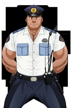 Qw1TengBshan, solo, looking at viewer, short hair, shirt, 1boy, hat, male focus, thighs, cowboy shot, collared shirt, belt, pants, uniform, muscular, feet out of frame, facial hair, thick thighs, arms behind back, black pants, thick eyebrows, blue shirt, pectorals, muscular male, bara, beard, large pectorals, bulge, black belt, sideburns, mature male, stubble, blue pants, tight, handcuffs, police, chest hair, police uniform, leg hair, arm hair, hairy, police hat