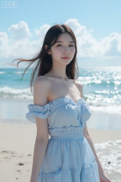 In the sunny beach scene, a beautiful beauty stands on the delicate white sand, the sea breeze blows on her silky brown hair, and her hair dances lightly with the wind. She was wearing a light blue off-shoulder dress, the folds of her skirt drooped naturally and gently swung in the breeze. The beauty's skin exudes a healthy luster. On her delicate face, her bright big eyes flash with a lively light. Under her high nose bridge, her lips slightly raised, revealing a charming smile. The background is an endless blue sea, with waves gently patting the beach, and a few white clouds floating in the sky, and the sun shining on the sea surface, sparkling. The overall tone is mainly blue and gold, creating a fresh and romantic atmosphere. The picture style is high-definition realistic photography, showing the charming style of the beauty on the beach.
