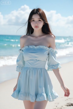 In the sunny beach scene, a beautiful beauty stands on the delicate white sand, the sea breeze blows on her silky brown hair, and her hair dances lightly with the wind. She was wearing a light blue off-shoulder dress, the folds of her skirt drooped naturally and gently swung in the breeze. The beauty's skin exudes a healthy luster. On her delicate face, her bright big eyes flash with a lively light. Under her high nose bridge, her lips slightly raised, revealing a charming smile. The background is an endless blue sea, with waves gently patting the beach, and a few white clouds floating in the sky, and the sun shining on the sea surface, sparkling. The overall tone is mainly blue and gold, creating a fresh and romantic atmosphere. The picture style is high-definition realistic photography, showing the charming style of the beauty on the beach.