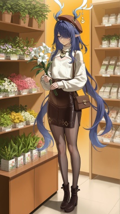 masterpiece,best quality,amazing quality,<lora:lauma_(genshin_impact)-000018:0.8>,lauma \(genshin impact\),1girl,pointy ears,hair over one eye,blue eyes,blue hair,<lora:20250808-1754650692631:0.8>,antlers,zhigan3d,flat chest,1girl,solo,warm_winter_style,cream_high_neck_sweater,ribbed_texture,brown_corduroy_midi_skirt,A-line_skirt,black_ankle_boots,thick_tights,woolen_beret,small_leather_handbag,holding_flower_bouquet,standing_at_flower_stand,flower_shop,fresh_roses,lilies (on shelf),green_leafy_plants,soft_store_light,daytime,floral_scent (implied),gentle_expression,