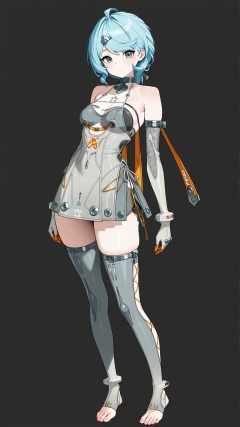 masterpiece,best quality,amazing quality,<lora:)-000017:0.8>,seed \(zenless zone zero\),1girl,solo,gloves,toeless legwear,elbow gloves,blue hair,full body,white background,barefoot,looking at viewer,simple background,grey dress,standing,green eyes,hair ornament,stirrup legwear,closed mouth,grey thighhighs,ahoge,bare shoulders,hairclip,black background,dress,short hair,grey gloves,thighhighs,toes,toeless footwear,