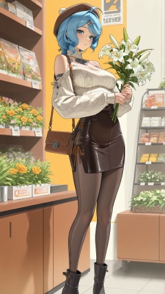 masterpiece,best quality,amazing quality,<lora:)-000017:0.8>,seed \(zenless zone zero\),hair ornament,1girl,blue eyes,ahoge,blue hair,<lora:20250808-1754650692631:0.8>,zhigan3d,1girl,solo,breasts,jewelry,looking at viewer,1girl,solo,warm_winter_style,cream_high_neck_sweater,ribbed_texture,brown_corduroy_midi_skirt,A-line_skirt,black_ankle_boots,thick_tights,woolen_beret,small_leather_handbag,holding_flower_bouquet,standing_at_flower_stand,flower_shop,fresh_roses,lilies (on shelf),green_leafy_plants,soft_store_light,daytime,floral_scent (implied),gentle_expression,