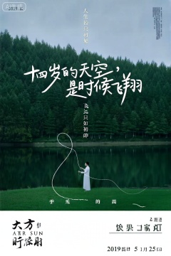 平静水面倒映着葱郁森林,远景宁静悠远。前景一位白衣人立于草地,手中丝线弯绕有灵动之感。画面醒目处有汉字“十四岁的天空,是时候飞翔”,下方小字“人生若只如初见”。底部标注电影《大象的眼泪》2019 年5 月25 日上映,整体静谧又怀旧。