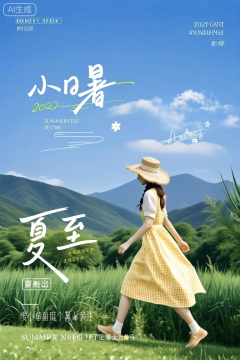 画面中,一位身着黄色格纹裙、头戴草帽的女子漫步于葱郁绿野,远处是连绵青山,澄澈蓝天飘着几朵白云。画面融入“小暑”“夏至”等中文元素,下方还有“SUMMER FEST 2025”字样,整体营造出2025 年夏日小暑时节的宁静美好氛围。