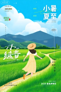 一幅充满夏日气息的画面。一位身着黄色格纹裙、头戴草帽的女子漫步在葱郁绿田间,远处是连绵青山,湛蓝天空飘着云朵。画面中多处标注“2025”字样,还有“小暑”“夏至”等中文节气元素,洋溢着2025年夏日的宁静与美好。