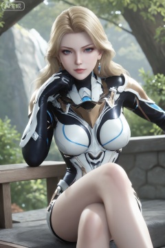 1girl, solo, long hair, breasts, looking at viewer, blue eyes, blonde hair, jewelry, sitting, earrings, lips, bodysuit, crossed legs, hand on own face, realistic,