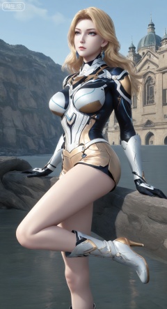1girl, solo, long hair, breasts, blue eyes, blonde hair, jewelry, medium breasts, earrings, lips, bodysuit, high heel boots,blonde shorts,