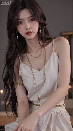 1girl, solo, long hair, breasts, looking at viewer, smile, bangs, dress, bare shoulders, jewelry, sitting, very long hair, closed mouth, white dress, bracelet, Light, shadow
