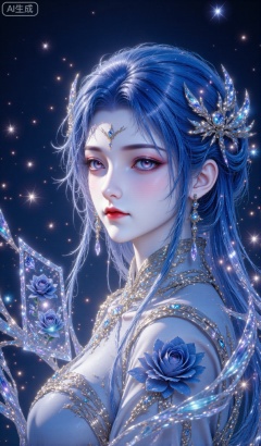 Background: On a black background, there is a transparent envelope with dark blue roses inside the envelope, and the flowers are full and beautiful. A large number of twinkling stars, fine sequins and crystal-like decorations are dotted around, emitting a brilliant light as a whole. The style is a fantastic and gorgeous fairy tale style