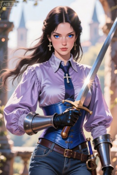 超精细细节:(杰作)、(最佳质量)、(最好的插图)、精细细节、超细节反射环境光、超现实缎面纹理、电影级照明(柔和边缘)、(模糊轮廓)、(朦胧的阳光)、(没有刺眼的阴影)、(柔和的颜色)“去饱和的{赤土|鼠尾草|燕麦片},有{5-15%}的活力”:“去饱和{赤土|鼠尾草|燕麦},有{5-15%}的活力”散景:一幅浅景深的女性特写肖像,用宽光圈镜头(f/1.4)拍摄,强烈的背景模糊,有发光的散景光,柔焦效果,自然背光阳光创造镜头光晕和立体光晕,梦幻浪漫风格增强:“超现实主义摄影,魔幻现实主义,工作室照明,4K细节织物纹理“动态效果:”风吹袖子,动态浮动领带,抗重力衣领褶皱“,银色,银色1girl,独奏,文艺复兴主题,深色长马尾辫,紧身,击剑衬衫,抱着,闭着嘴,盯着观众,很长的头发,站着,薰衣草衬衫,蓝眼睛,浓密的眉毛,武器,牛仔射击,蓝色眼睛,裤子,苍白的皮肤,蓬松的袖子,护套,护套,皮革护腕,一只眼睛上的青色紧身胸衣,雀斑女性,奇装异服,渐变背景,皮革紧身胸衣,皇家蓝色腰带,刺绣衬衫,手持武器的花式剑,手持花式匕首,剑,文艺复兴时期意大利别墅背景,配饰:穿黑色衣领配有银色十字架吊坠,左手戴黑色手套,右手露出,形成鲜明对比。波浪线设计的金色耳环巧妙地拉长了脸,细节