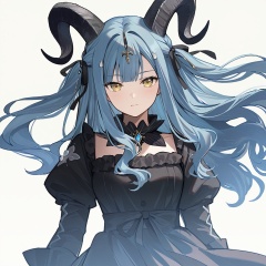 masterpiece, best quality,solo,(white background:1.2),simple background,1girl,looking at viewer, togawa sakiko,bangs,ribbon,hair ribbon,black ribbon,two side up,blue hair,grey hair,sidelocks,blunt bangs,yellow eyes,long hair,wavy hair,shirt, gloves,dress,pantyhose,boots,black gloves,black footwear,high heels,black pantyhose,thighhighs, dress,tail, horns, black dress,hair ornament,<lora:舟祥ill2pro:0.8>