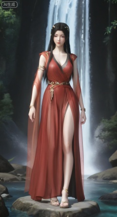 Yuan Yao,1girl, solo, long hair, black hair, hair ornament, full body, bracelet, red dress, waterfall,realistic ,