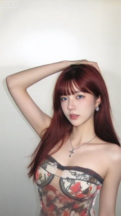 a photo-realistic shoot from a portrait camera angle about a young woman with long red hair and a stylish outfit,posing confidently against a plain light background,the image also shows a woman with fair skin,wearing a sheer top with a floral design,a silver necklace with a cross pendant,and earrings,on the middle of the image,a 20-year-old woman appears to be looking directly at the viewer with a neutral expression,she has long,straight,red hair with bangs and blue eyes,her hair is styled in a way that frames her face,and she is wearing a see-through top that reveals her bare shoulders,the woman is standing with one arm raised,and her hand is resting on her head,the lighting is soft and natural,casting gentle shadows on her face and body,