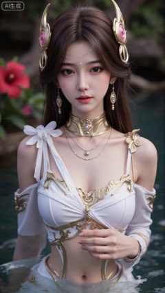 1girl, solo, long hair, breasts, looking at viewer, blush, open mouth, bangs, brown hair, hair ornament, dress, bare shoulders, brown eyes, medium breasts, collarbone, flower, parted lips, hair flower, water, white dress, sleeveless dress, leaf, plant, red flower, partially submerged, hibiscus