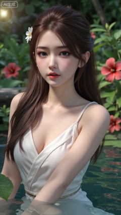1girl, solo, long hair, breasts, looking at viewer, blush, open mouth, bangs, brown hair, hair ornament, dress, bare shoulders, brown eyes, medium breasts, collarbone, flower, parted lips, hair flower, water, white dress, sleeveless dress, leaf, plant, red flower, partially submerged, hibiscus