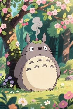 卡通插图,以动漫电影《龙猫》中可爱的森林精神龙猫为特色,创作一幅温馨而异想天开的卡通风格数字插图。龙猫舒适地坐在一棵盛开的樱桃树下,周围环绕着郁郁葱葱的绿叶和盛开的野花。阳光透过树叶,在柔软的草地上投下错综复杂的斑驳阴影。背景中,一座传统的日本茅草屋坐落在树林中,烟囱里缓缓升起缕缕烟雾。这个场景充满了宁静和魔力,强调了自然与神秘世界的和谐。