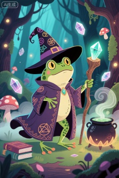 卡通插图,以青蛙巫师为特色的异想天开的数字插图。青蛙戴着一顶饰有魔法符文的尖尖巫师帽,一件绣有复杂奥术符号的长袍,还拿着一根顶部有发光水晶的粗糙木棍。背景是一片神秘的森林,有古树、发光的蘑菇和漂浮的水晶,投射出迷人的光芒。这个场景充满了神奇的元素,如旋转的薄雾、漂浮的书籍和一个冒着神秘药水的大锅。青蛙的眼睛闪闪发光,皮肤光滑逼真,有绿色和苔藓的色调。整体构图平衡,充满幻想,柔和的漫射灯光增强了神奇的氛围。青蛙袍飘逸飘逸,刺绣细节精心制作。发光的水晶发出柔和的空灵之光,用神奇的光芒照亮周围的环境。