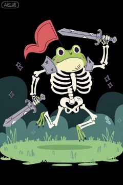 卡通插图,创建一个生动而怪异的数字插图,以一只带有草元素的蟾蜍为骨架骑士。蟾蜍身上装饰着青草般的纹理,有着幽灵般的外观,融入了骷髅骑手的形态。骨骼结构上布满了破旧的盔甲和古老的武器,漂浮在薄雾弥漫的草地和昏暗的超凡脱俗的灯光下。整个场景散发出一种令人难忘的神秘氛围。