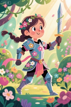 卡通插图,一位可爱的女战士,饰有花卉元素,盔甲上有精致的花朵图案和飘逸的丝带。她表情温和,眼睛闪闪发光,一脸坚定。她的头发扎成辫子,上面缠绕着藤蔓和花朵。周围的环境郁郁葱葱,鲜花盛开,色彩鲜艳,透过树叶投射出柔和温暖的光线。场景被神奇的光芒照亮,增强了自然与战士之间的和谐。构图与动态运动相平衡,捕捉到优雅和力量的精髓。
