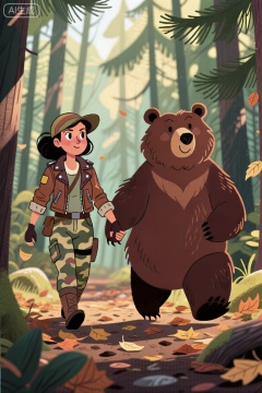 卡通插图,一位女猎人和她的棕熊同伴穿过茂密的森林。猎人穿着粗糙的迷彩服和一件风化的皮夹克,脸上带着决心和一丝经验。她的伴侣棕熊强壮而温柔,它的皮毛在透过树冠的斑驳阳光下闪闪发光。他们和谐地走在一起,他们的纽带在每一步都很明显。环境细节丰富;落叶在脚下嘎吱作响,空气中弥漫着松树和泥土的味道。这一场景是用电影镜头拍摄的,强调了猎人和她的熊之间的原始美和亲密联系,其风格让人想起《国家地理》的摄影。