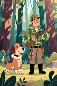 卡通插图,猎人带着他忠诚的猎狗,两人都自信地站在茂密的森林里。猎人穿着一件绿色迷彩夹克,腰带上系着各种狩猎工具,而他的狗则穿着一件带皮领的棕色毛皮外套。他们站在高大的树木背景下,斑驳的阳光透过树叶照射进来,营造出一个自然而宁静的环境。这一场景捕捉到了人与野兽之间的纽带,猎人坚定的目光和狗警惕的表情。色彩丰富而朴实,有一种温暖而诱人的氛围。猎人拿着步枪,狗已经准备好了,强调他们已经为冒险做好了准备。
