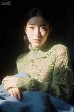 Surrealist art chinese girl,18yo,Portrait Studio,facial,official art,photographic lights,warm light,black background,realistic,solo,Sony A7R IV with Sony FE 85mm f-1.4 GM,Agfa Vista 400,green sweater,a blue blanket,surrealistic,16k image quality,sparse mesh sweater, . Dreamlike, mysterious, provocative, symbolic, intricate, detailed