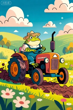 卡通插图,一只胖乎乎的蟾蜍开着一辆老式拖拉机,周围是郁郁葱葱的绿地和野花。蟾蜍穿着工装裤,戴着草帽,脸上带着坚定的表情。拖拉机的轮子在穿过风景时搅动泥土,留下一条新耕的泥土痕迹。这一幕沐浴在温暖的金色阳光下,在地上投下长长的阴影。背景包括连绵起伏的丘陵和点缀着蓬松云朵的湛蓝天空。这张照片有一种异想天开和怀旧的感觉,纹理细腻,光线柔和自然。